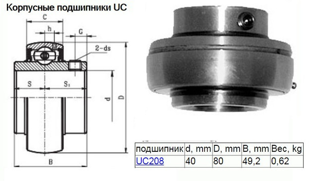 Радиальные шариковый подшипник UC208 (подшипник качения шариковый радиальный однорядный с двумя уплотнениями и широким внутренним кольцом) размер (40х80х21/49,2)